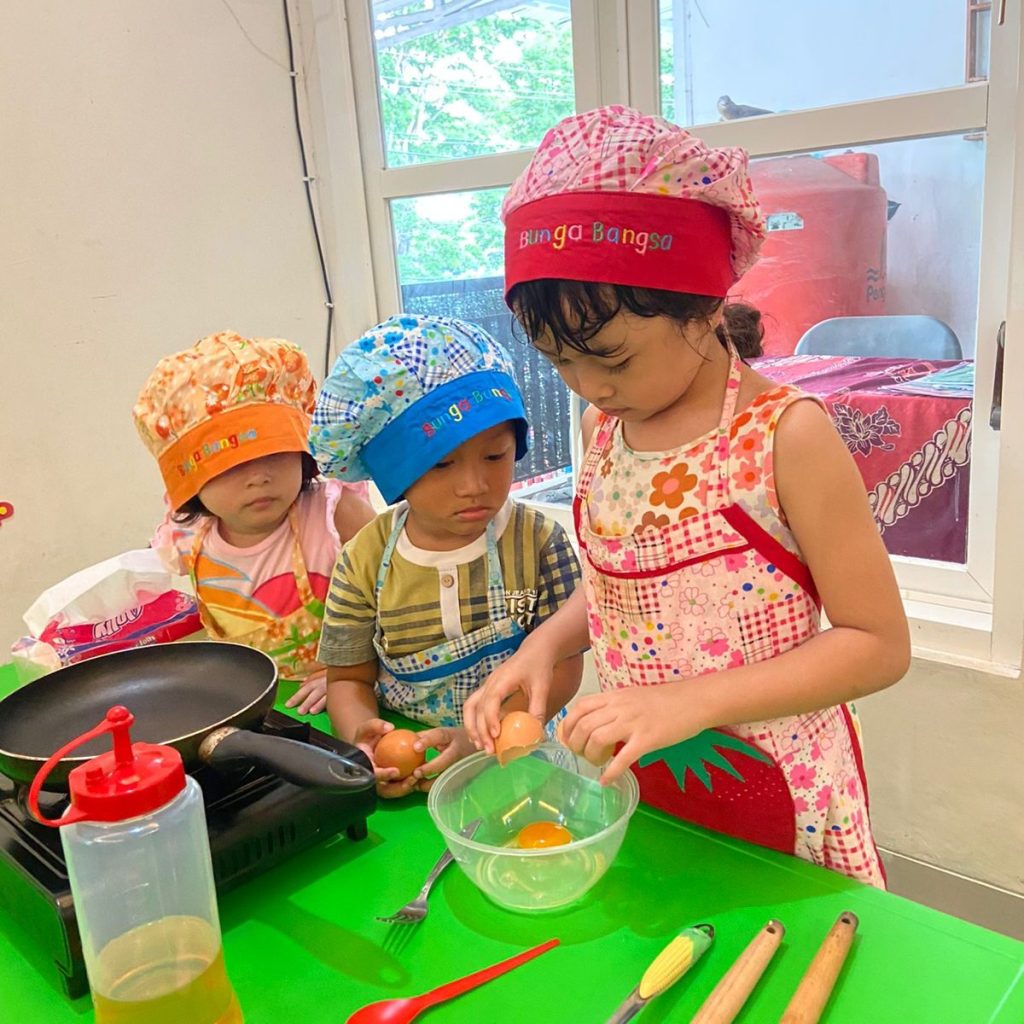 Bunga Bangsa Universal School juga mengadakan kegiatan cooking class yang seru. Anak-anak diajak untuk berkreasi di dapur, belajar mengenal bahan makanan, dan mengikuti langkah-langkah sederhana dalam membuat hidangan. Kegiatan ini tidak hanya melatih motorik halus dan kemandirian, tetapi juga menumbuhkan minat mereka terhadap dunia kuliner. Mereka belajar tentang kebersihan dan keselamatan di dapur, serta merasakan kepuasan saat menyantap hasil karya mereka sendiri. Suasana cooking class dipenuhi dengan keceriaan dan semangat belajar dari para koki cilik!